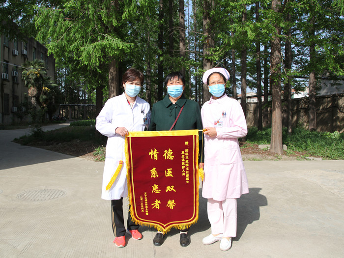 原來(lái),這位大媽的老伴兒叫王子正,今年72歲了,是一位患有矽肺、肺心病、冠心病、腦梗塞、帕金森病等基礎疾病的患者,今年1月時(shí),由于感染了新冠肺炎,王子正老人病情危重,經(jīng)過(guò)職業(yè)病科主任王紅梅及全科醫務(wù)人員的全力搶救,和三個(gè)多月的精心治療護理,現在身體基本康復。老人的兒子帶著(zhù)父母來(lái)到醫院,向醫護人員表示誠摯感謝,王子正老人的老伴兒將錦旗親手送到了院行風(fēng)辦。