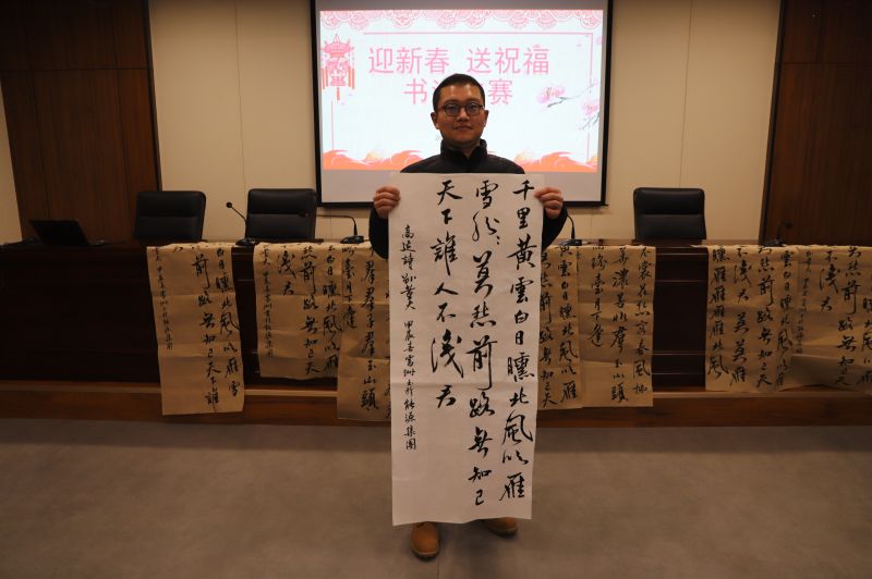 比賽期間,參賽選手們盡情揮毫潑墨,抒發(fā)著(zhù)對書(shū)法的熱愛(ài)??瑫?shū)蒼勁有力,既有雄健的力度,又不失柔和之美;隸書(shū)古樸典雅,方正中透著(zhù)嚴謹,散發(fā)著(zhù)渾厚而莊重的藝術(shù)氣息;行書(shū)如高山流水、瀟灑飄逸,不因時(shí)勢之變化而易其形,故能歷久彌新。比賽引來(lái)眾多同事駐足觀(guān)看,大家圍聚一起,一幅幅地欣賞著(zhù)、回味著(zhù),對喜歡的作品更是贊不絕口......現場(chǎng)洋溢著(zhù)迎新春的喜悅。最終經(jīng)過(guò)評委組綜合評定,吳霽洲同志榮獲本次書(shū)法比賽一等獎。