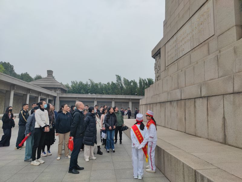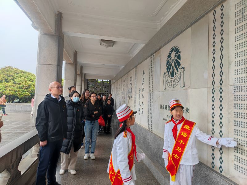 烈士陵園松柏靜哀、氣氛莊重,綿綿細雨中全體肅立,懷著(zhù)沉重的心,默哀三分、敬獻鮮花。大家邁著(zhù)緩慢的步伐繞塔一周,駐足瞻仰塔基上的場(chǎng)景浮雕,當年淮海戰役壯觀(guān)的場(chǎng)面和戰士們視死如歸的氣勢仿佛重現在眼前。在淮塔小衛士的帶領(lǐng)和講解下,觀(guān)詳烈士名錄,懷想革命先輩們浴血奮戰的歷史,不無(wú)感嘆革命先烈英勇無(wú)畏的壯舉。嚴守紀律、團結奮戰、不怕?tīng)奚?、勇于奉獻的精神深深觸動(dòng)著(zhù)在場(chǎng)的每一個(gè)人。