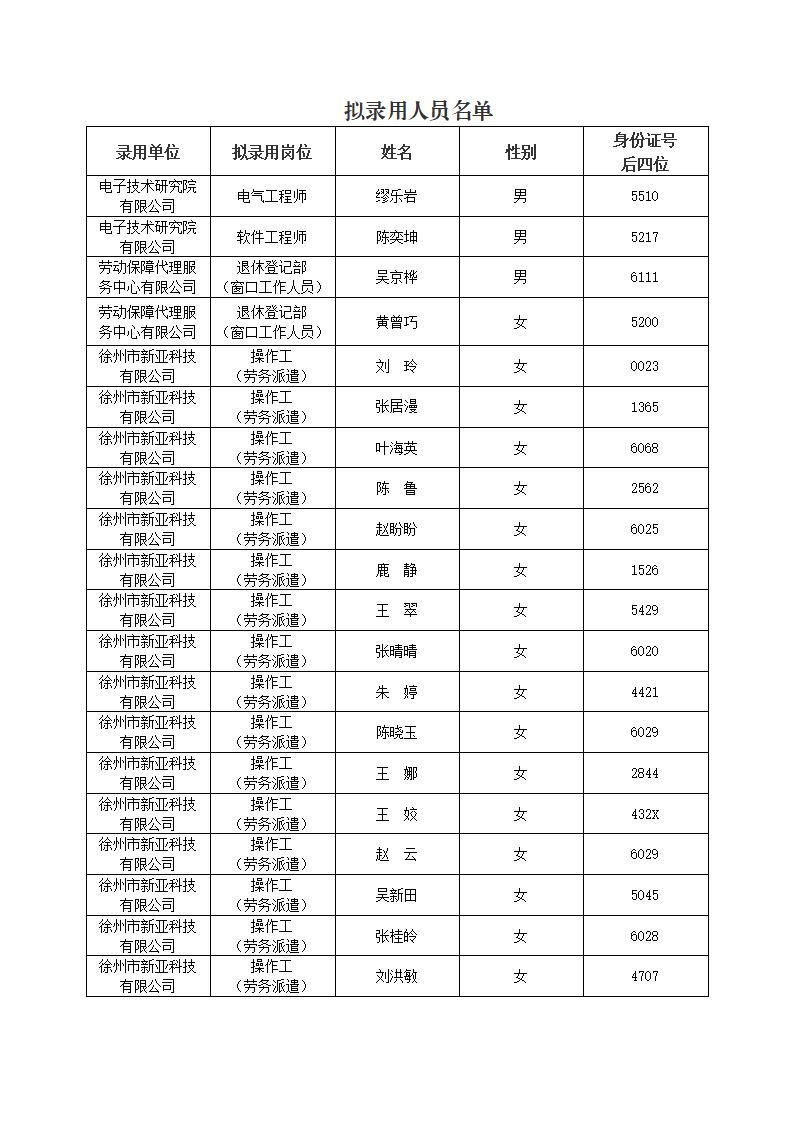 根據《徐州市國有資產(chǎn)投資經(jīng)營(yíng)集團有限公司招聘工作人員公告》相關(guān)要求,海鷗集團所屬電子技術(shù)研究院有限公司、勞動(dòng)保障代理服務(wù)中心有限公司、徐州市新亞科技有限公司公開(kāi)招聘工作已經(jīng)完成,現將擬錄用人員名單進(jìn)行公示。公示期自2023年5月6日起至5月11日止。如對公示對象錄用資格有異議,請于公示期內向海鷗集團組織人事部(紀檢監察室)反映。
