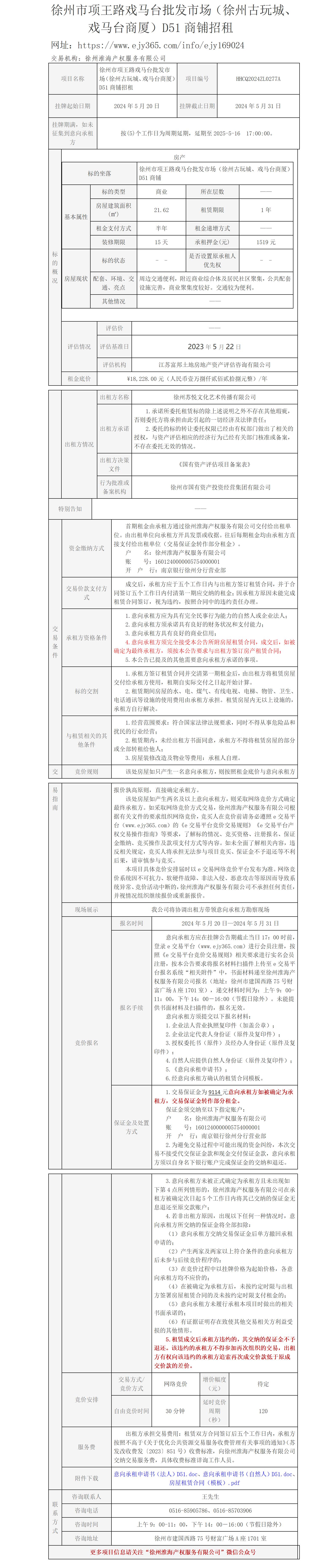 徐州市項王路戲馬臺批發(fā)市場(chǎng)(徐州古玩城、戲馬臺商廈)D51招租公告