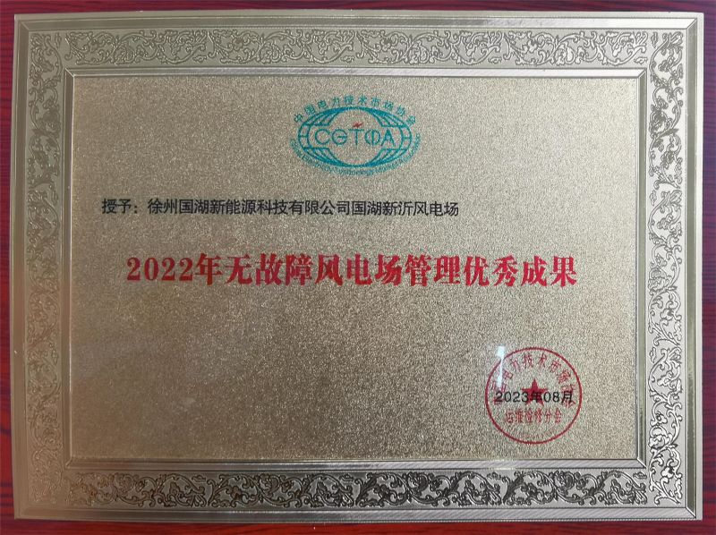 國湖新沂風(fēng)電場(chǎng)榮獲“2022年無(wú)故障風(fēng)電場(chǎng)管理優(yōu)秀成果”獎項