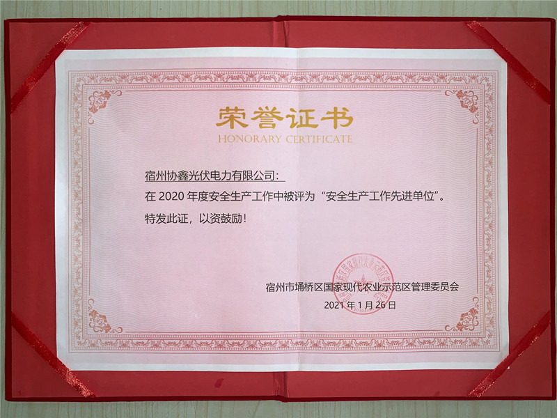 2021年2月1日,在國家現代農業(yè)示范區管委會(huì )召開(kāi)的年度安全工作會(huì )議上,管委會(huì )對國投環(huán)能公司所屬宿州協(xié)鑫光伏電站2020年度安全生產(chǎn)工作總體情況進(jìn)行通報,對人員持證上崗、安全目標責任書(shū)的落實(shí)以及電站各項安全宣貫培訓等工作做出高度評價(jià),授予國投環(huán)能公司所屬宿州協(xié)鑫光伏電站2020年度“安全生產(chǎn)工作先進(jìn)單位”榮譽(yù)稱(chēng)號。