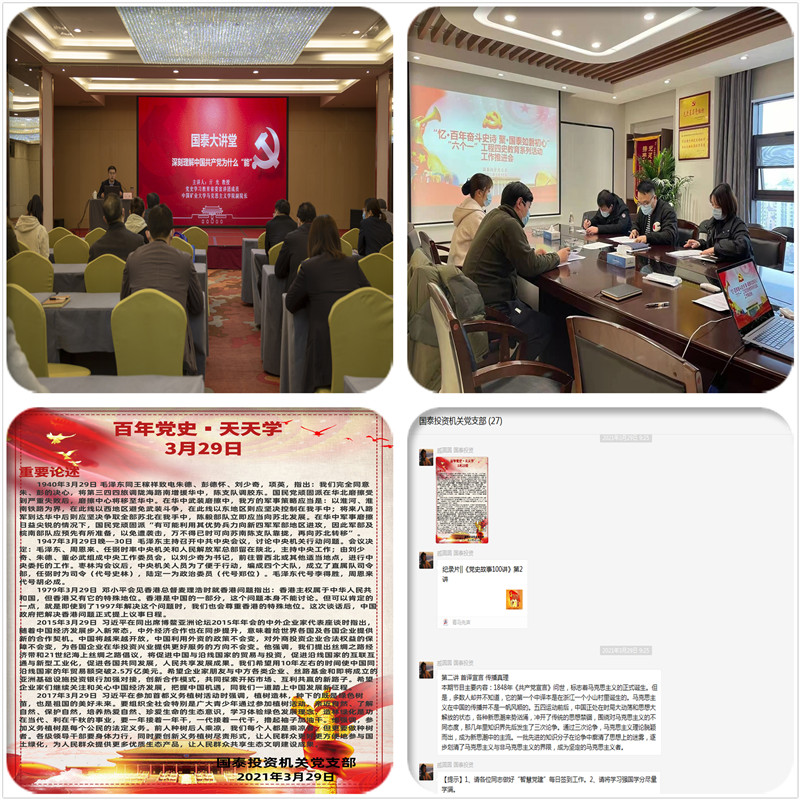二是強化領(lǐng)會(huì )精神,筑牢思想理論基礎。國泰投資組織全體黨員集中學(xué)習習近平總書(shū)記在黨史學(xué)習教育動(dòng)員大會(huì )上的重要講話(huà)精神,把黨史學(xué)習教育納入黨總支理論中心組、黨支部和黨員個(gè)人年度學(xué)習計劃,為黨員購買(mǎi)“四史”書(shū)籍,開(kāi)展讀一本黨史書(shū)學(xué)習交流活動(dòng)。通過(guò)豐富的歷史文獻和著(zhù)作,讓全體黨員對黨帶領(lǐng)人民不懈奮斗的光輝歷程,黨的思想理論創(chuàng )立、發(fā)展和完善的歷史進(jìn)程進(jìn)行全面學(xué)習了解,不斷深化黨史學(xué)習教育成效。