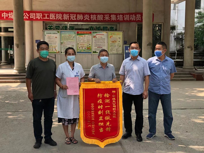 8月19日上午,泉山區火花辦事處領(lǐng)導一行來(lái)到中煤五公司職工醫院,并送上感謝信和錦旗,表示“在中煤五公司職工醫院的大力支持和幫助下,街道在規定時(shí)間內安全規范、高質(zhì)高效完成全員核酸檢測應急演練工作?;茧y與共、同舟共濟得 真情我們銘記在心、身懷感激”。院黨委書(shū)記宋俊祥代表全院參戰職工接受感謝信和錦旗,并表示今后將一如既往支持街道辦事處工作,共同戰役、共擔使命。