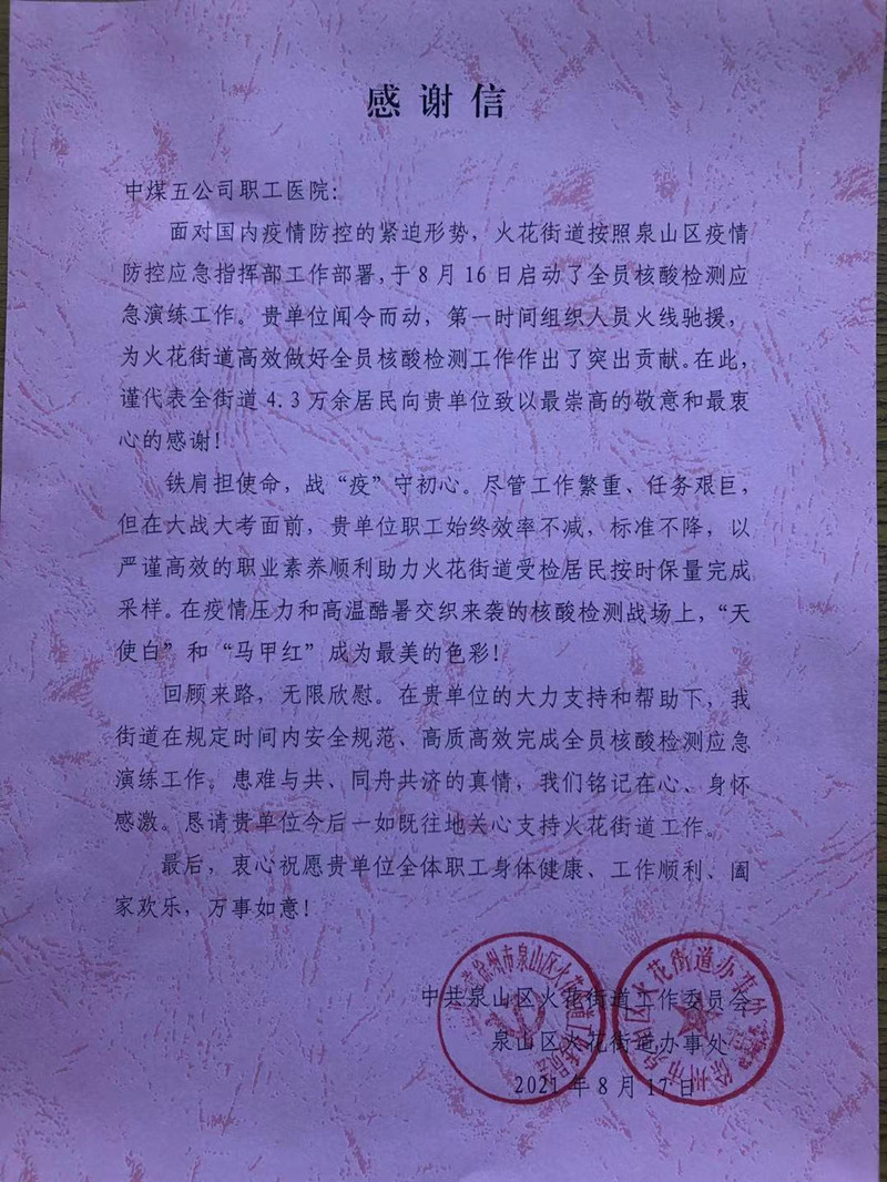 泉山區火花辦事處向中煤五公司職工醫院致感謝信和錦旗