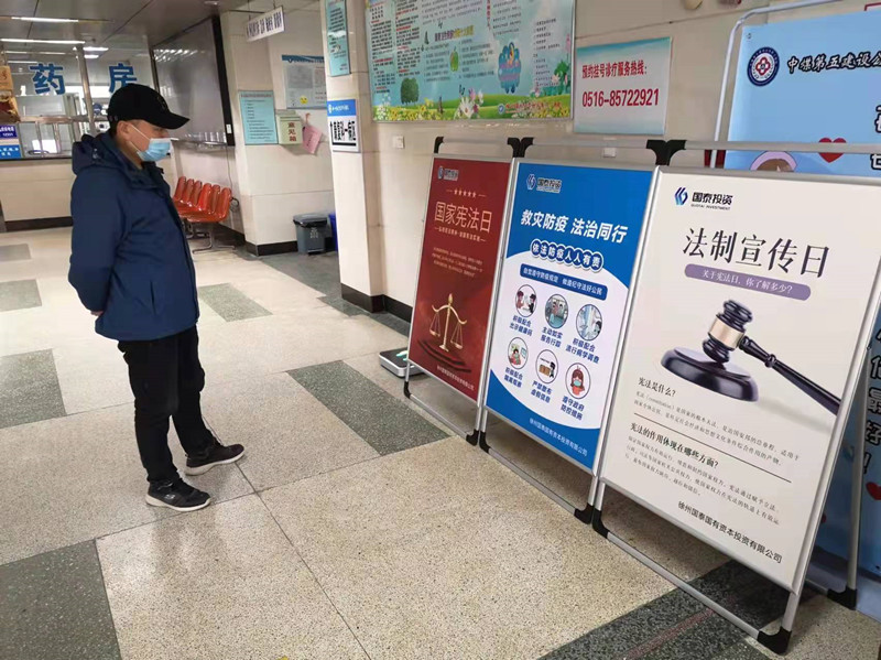國泰投資公司在所屬公司、醫院、酒店等人流密集場(chǎng)所布置“法制宣傳”、“憲法宣傳”、“疫情防控宣傳”展板,發(fā)放《憲法普及知識》《傳染病防控法普及知識》折頁(yè)進(jìn)行宣傳。