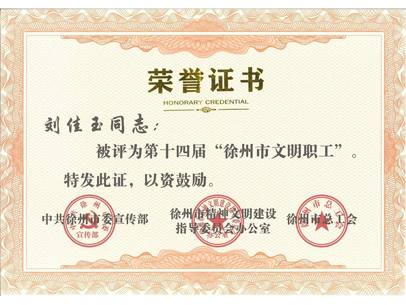 由徐州市委宣傳部、市文明辦、市總工會(huì )聯(lián)合開(kāi)展的第十四屆“徐州市十佳文明職工”和“徐州市文明職工”評選活動(dòng)揭曉,徐州市環(huán)保集團所屬公司職工劉佳玉被評為“徐州市文明職工”。
