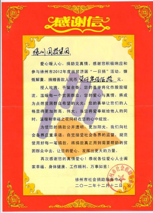 為認真貫徹市委辦公室、市政府辦公室《關(guān)于開(kāi)展扶貧濟困“一日捐”活動(dòng)的通知》(徐委辦﹝2012﹞105號)精神,集團公司于11月上旬組織開(kāi)展了扶貧濟困“一日捐”工作。截至目前,集團公司本部及所屬企業(yè)共捐款17700元。其中:集團公司本部捐款7350元,國泰公司捐款2650元,華強公司捐款520元,華安公司捐款1200元,金龍成功物業(yè)公司捐款750元,科創(chuàng )軟件園公司捐款780元,彭富公司捐款1430元,海鷗集團捐款3020元。
