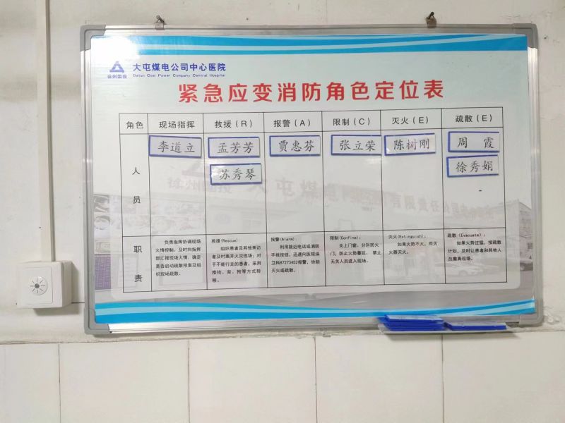為明確各級崗位人員火災救援分工職責,建立火災快速響應機制,大屯公司中心醫院在學(xué)習總結先進(jìn)工作經(jīng)驗的基礎上,結合實(shí)際情況,設立了“科室火災角色定位分工展示牌”,以明確在班職工的消防角色定位,提高職工的消防滅火和應急疏散能力。