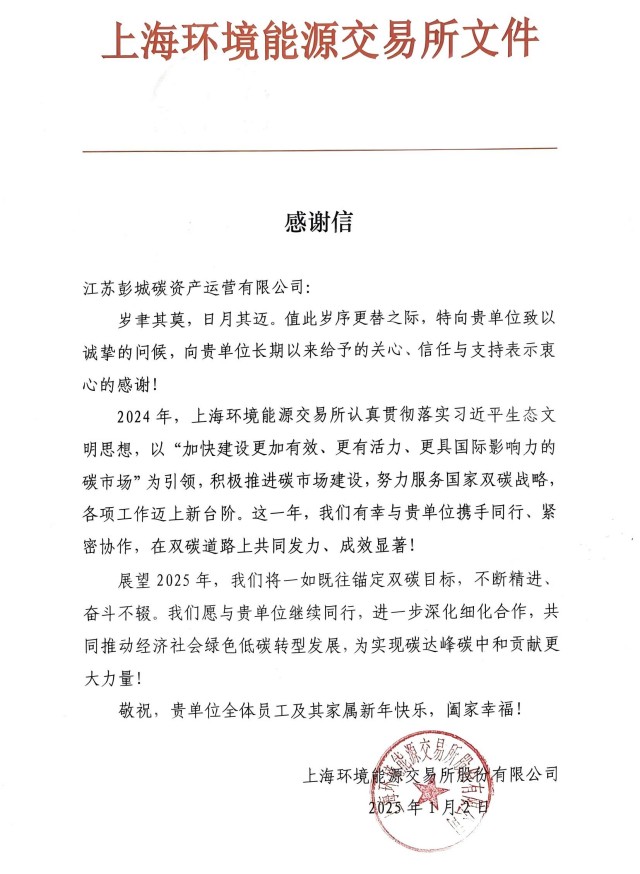 上海環(huán)境能源交易所致彭城碳資產(chǎn)公司的感謝信