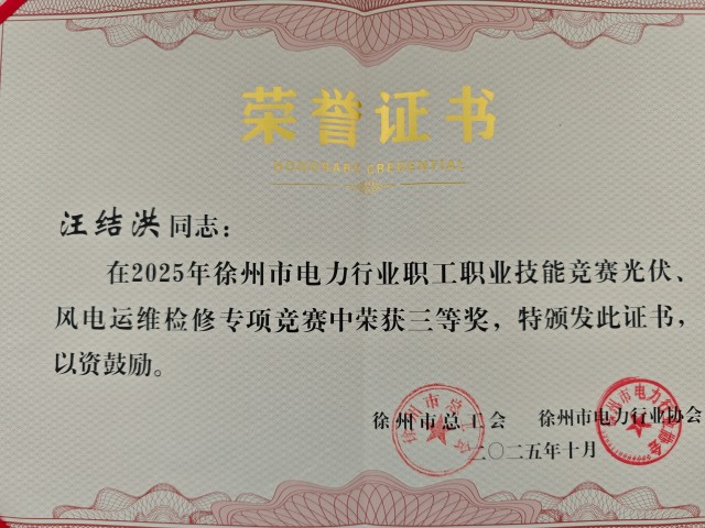 近日,由徐州市總工會(huì )和徐州市電力行業(yè)協(xié)會(huì )主辦、華潤電力徐州公司承辦的2025年徐州市電力行業(yè)職工職業(yè)技能競賽光伏、風(fēng)電運維檢修專(zhuān)項競賽圓滿(mǎn)落幕,國爍公司派員參加并喜獲三等獎。